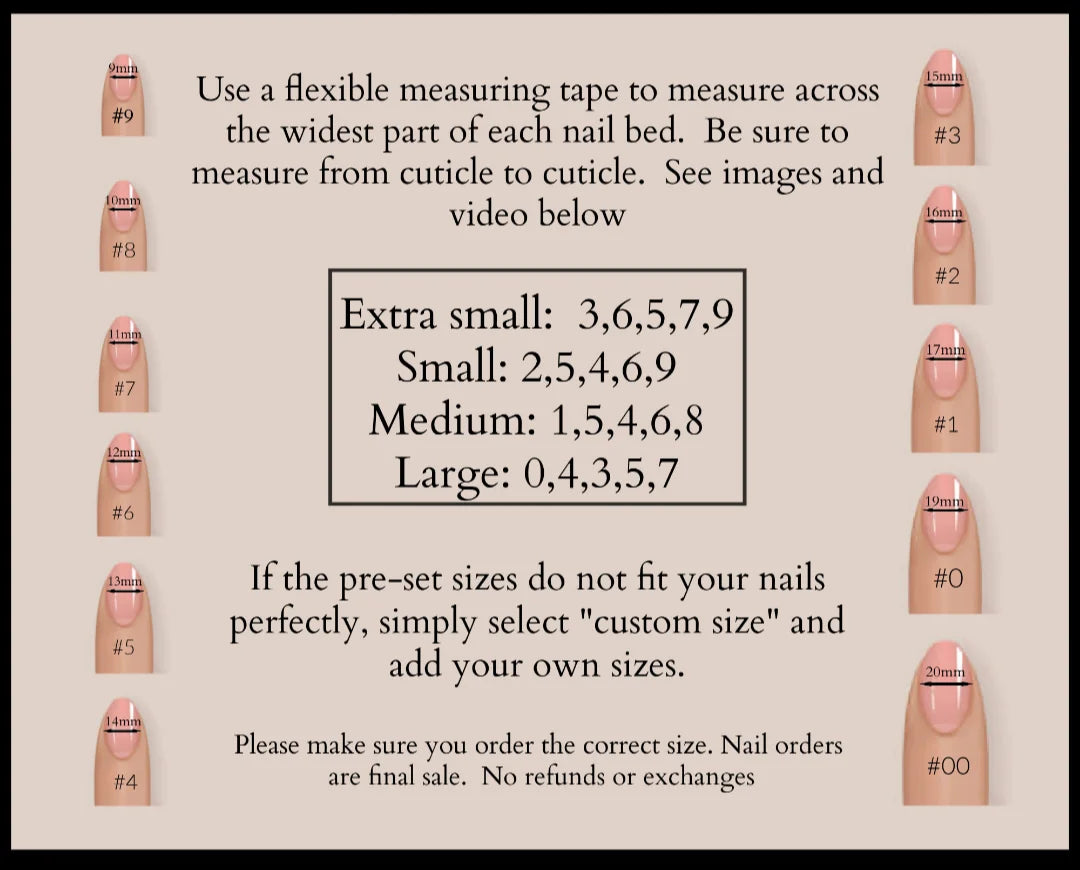 Since our nails are crafted by hand, please note that each set may slightly vary from the photos on our website. These small, unique differences are a natural result of the handmade process and add to the one-of-a-kind beauty of your nails.